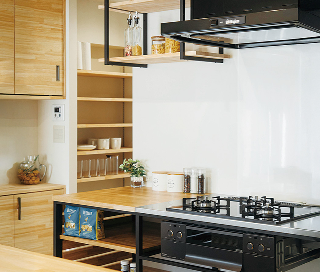 ガスコンロを備えた壁側のキッチンと吊り棚も同じテイストで造作。左手にはキャビネットと可動棚があり、収納スペースは十分。
