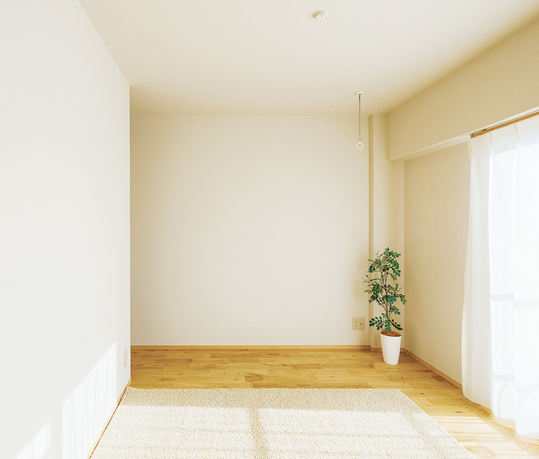 和室を洋室に変更。窓寄りの天井にホスクリーンを設置し、室内干しも可能に。左の壁の裏側には、設計側からの提案で回遊性をもたせた大容量のクローゼットがあり、可動棚とハンガーパイプの両方を備えている。