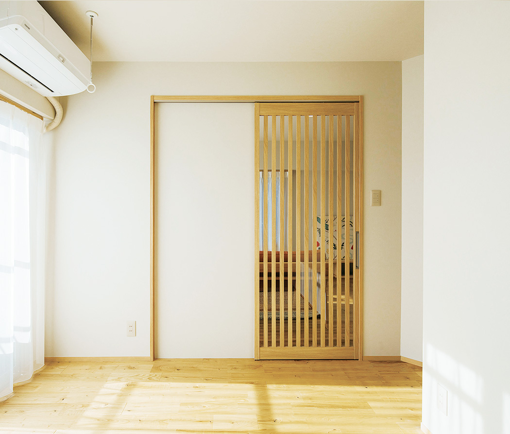 洋室とリビングの間を仕切る和モダンな雰囲気の建具はパナソニック製。縦格子の中に透明のガラスを入れたデザインを選んだ。