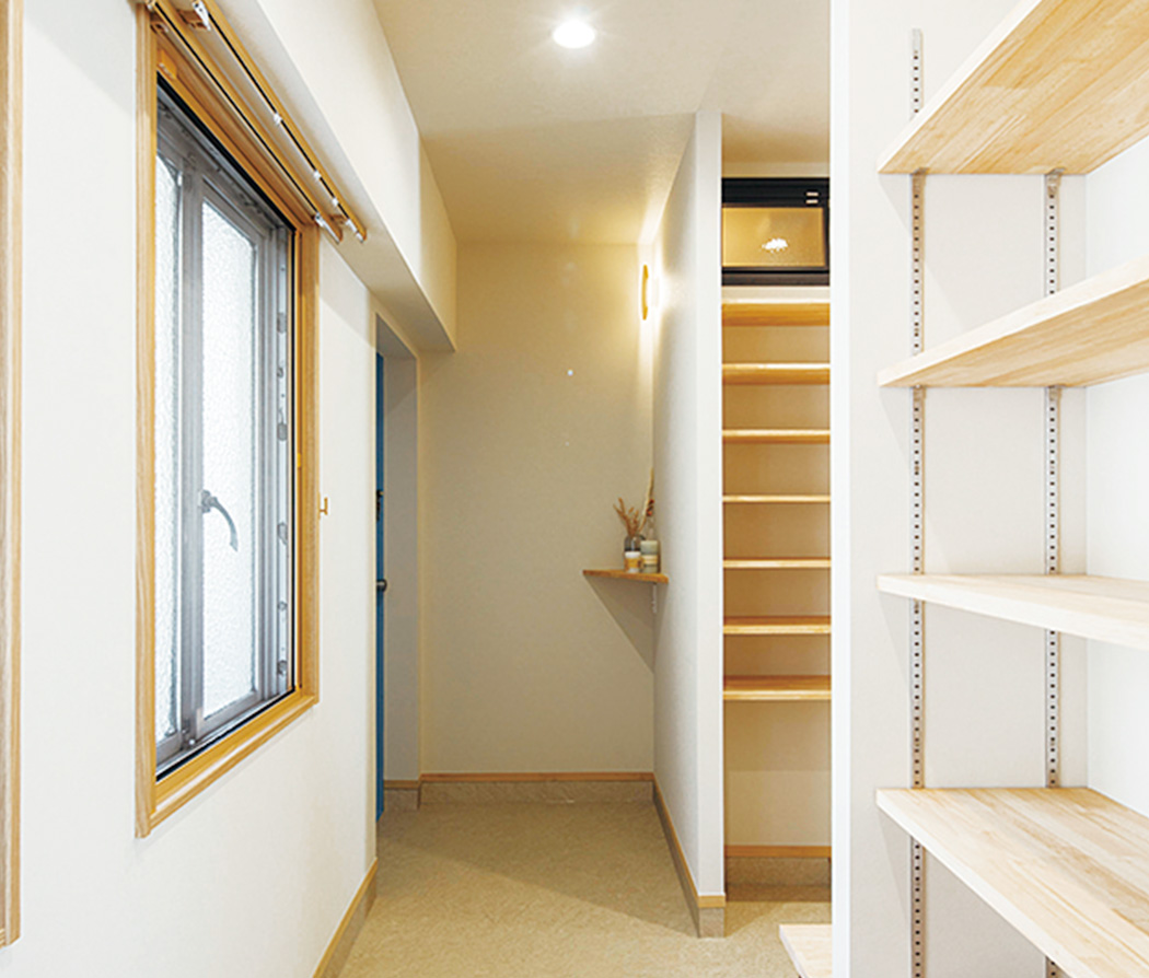 キッチン近くにあった収納は、両側に可動棚を新設して使い勝手の良いパントリーに一新。キッチンまわりの収納力が従来よりも大きく高まった。