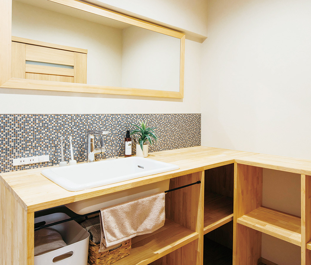 トイレを移動したことで広さが増した洗面脱衣室。複数人が同時に使えるように横長の鏡を取り付け、L字型に造作した洗面台の下には着替えやタオルなどを収納できるようにしている。