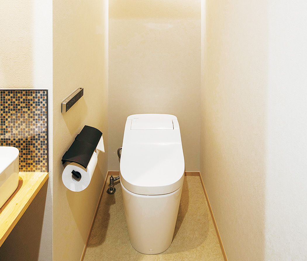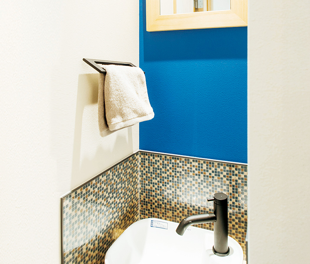 トイレの入り口には造作の手洗い台を設け、壁の一面のみ玄関ドアと同じ色の鮮やかな青をあしらった。水跳ねが気になる立ち上がり部分にはモザイクタイル風のパネルを採用している。