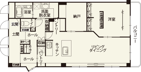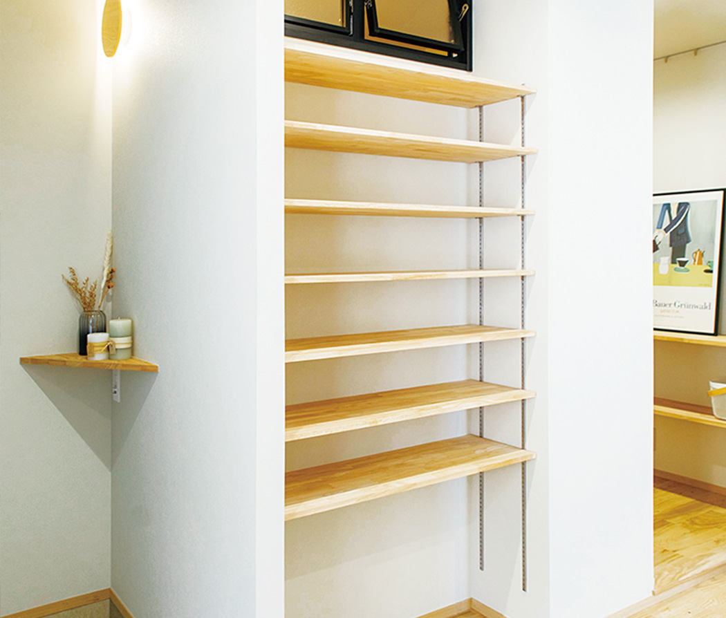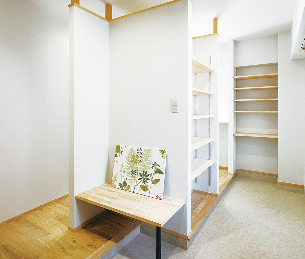 洋室だった場所は玄関土間の拡張とホールに変更し、シューズクローゼットとしても使える可動棚や、座って靴を履くのに便利な造作ベンチも設けた。