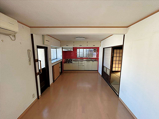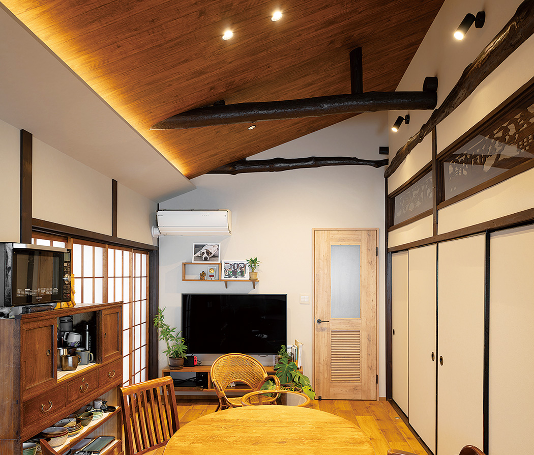 梁を見せつつ勾配天井で開放的な空間を実現。LDKの天井は研磨して塗装した梁を現しに。勾配天井には木目のクロスを使用して古民家ならではの風情を演出。
