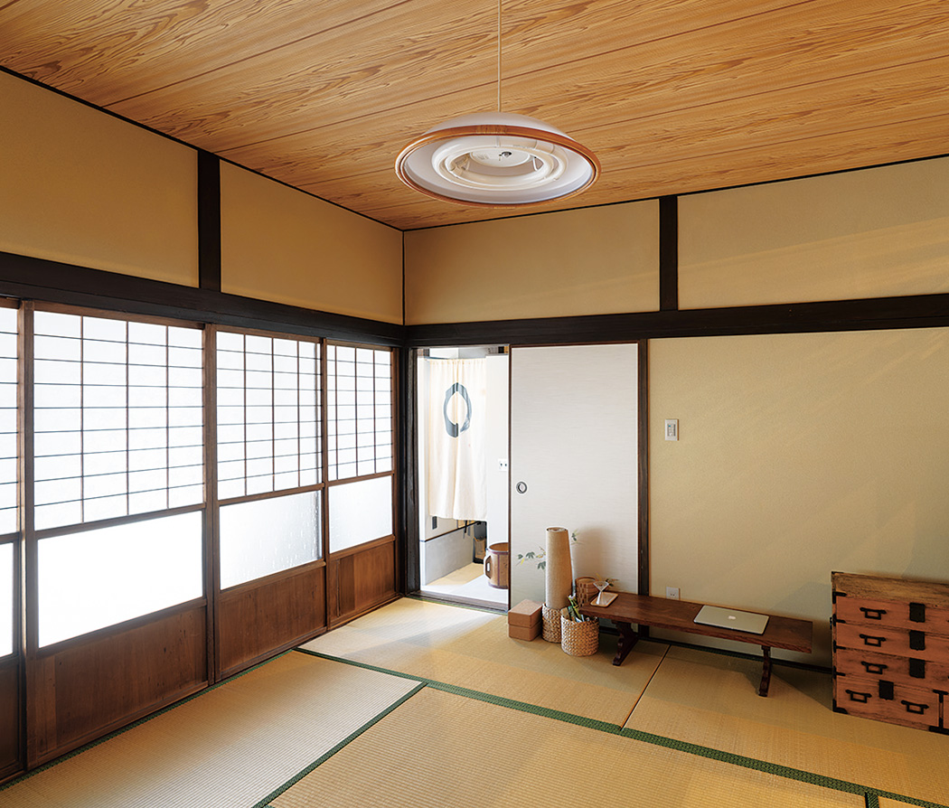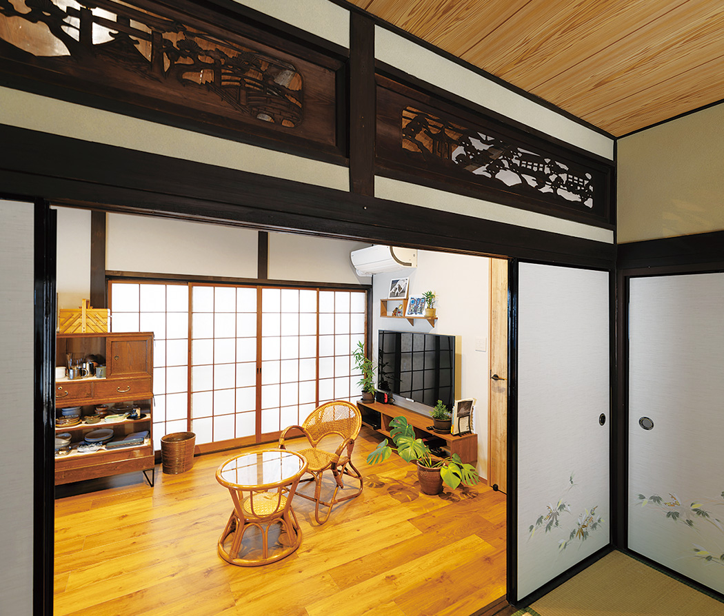 和室は天井や床の下地を取り替え、畳を再利用してリフレッシュするのみにとどめた。リノベーションしたLDKも元の雰囲気を残しているため、和室とのつながりに違和感を感じさせない。欄間など既存の建具も再利用することで元の家の風情を残している。