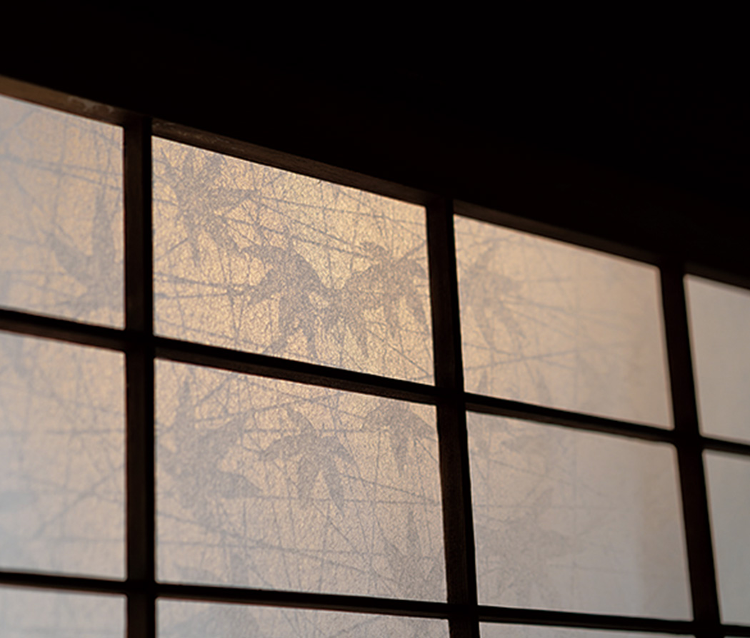 紅葉の透かし模様が入った和室の障子。広縁からの明かりで美しい模様が映える。
