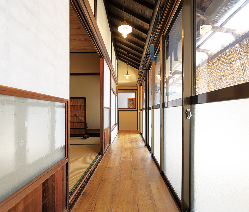 広縁の天井は野地板を現しにし、壁は聚楽壁に塗り替え。サッシや和室の建具は既存のものを生かし、元の家の雰囲気を残した。