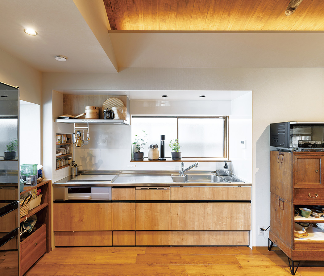 システムキッチンは収納に優れたLIXILの「アレスタ」を採用。左手の出窓の下には、もともと持っていた木のおもちゃ箱がジャストフィット。キッチンは展示品を使うなどコストバランスを図った。