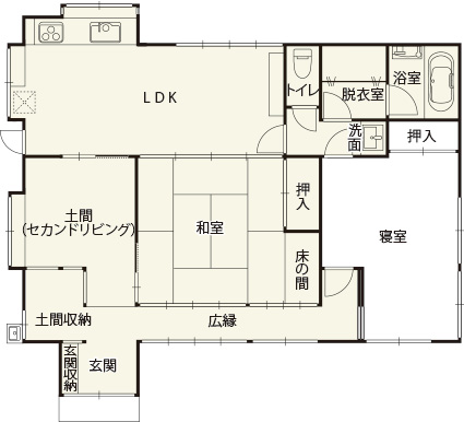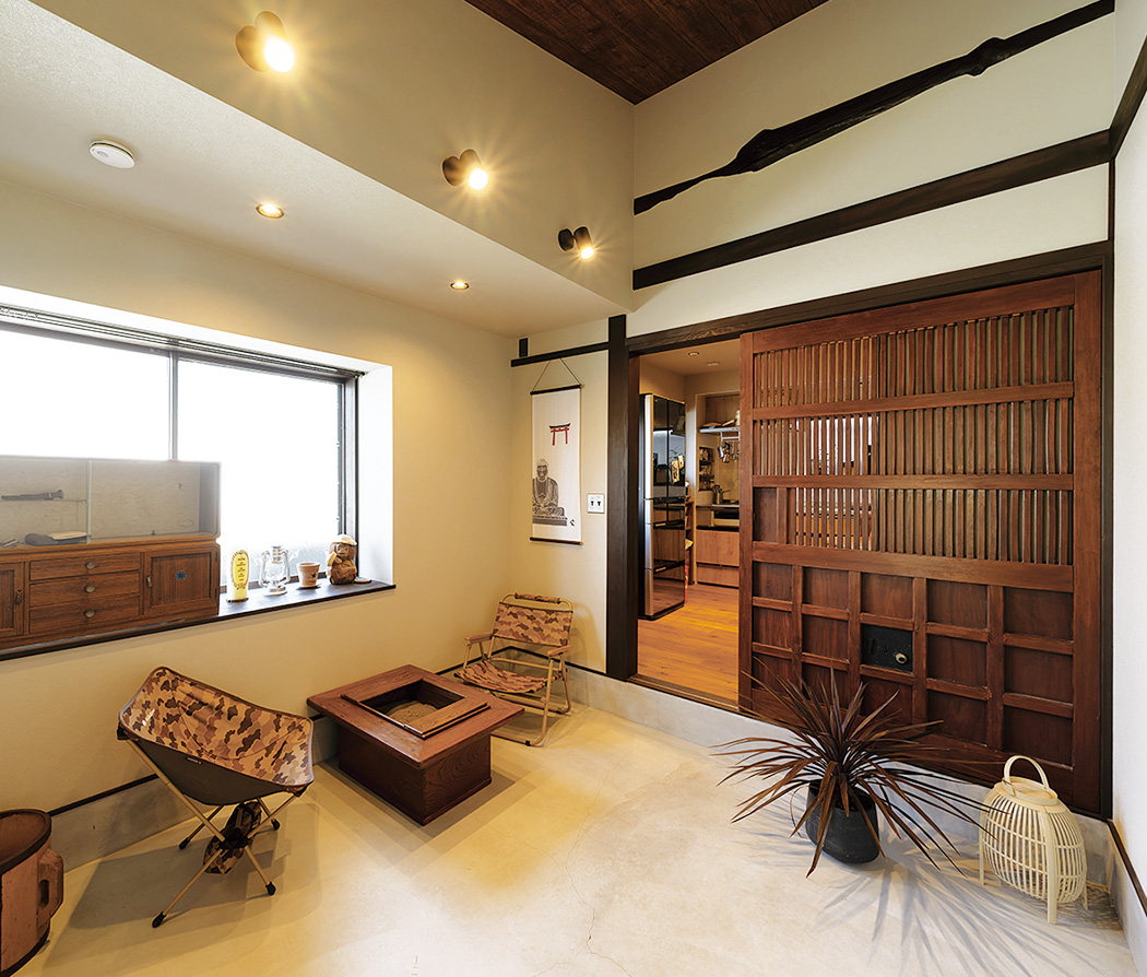 元のLDKの一部とトイレ、ホールを取り込んで土間スペースに。屋外と屋内を緩やかにつなぐセカンドリビングとして使用。アンティークの蔵戸や火鉢、出窓に並べた小物類など、ご夫婦の好きなものに囲まれる空間。