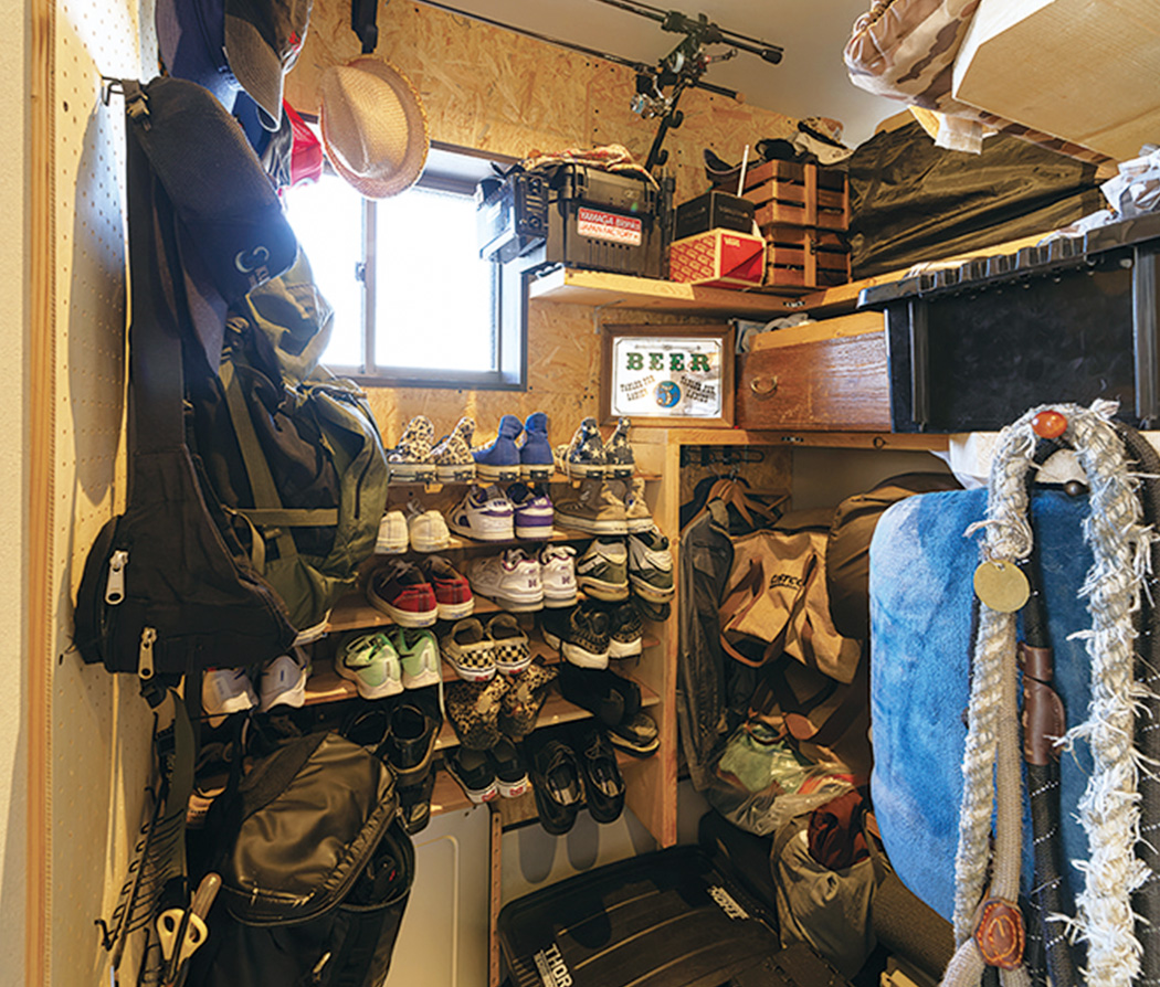 玄関に設けた大容量の土間収納には、シューズやキャンプ用品など屋外で使うものを収納。棚はH様がDIYで設置して整理しやすいように工夫した。