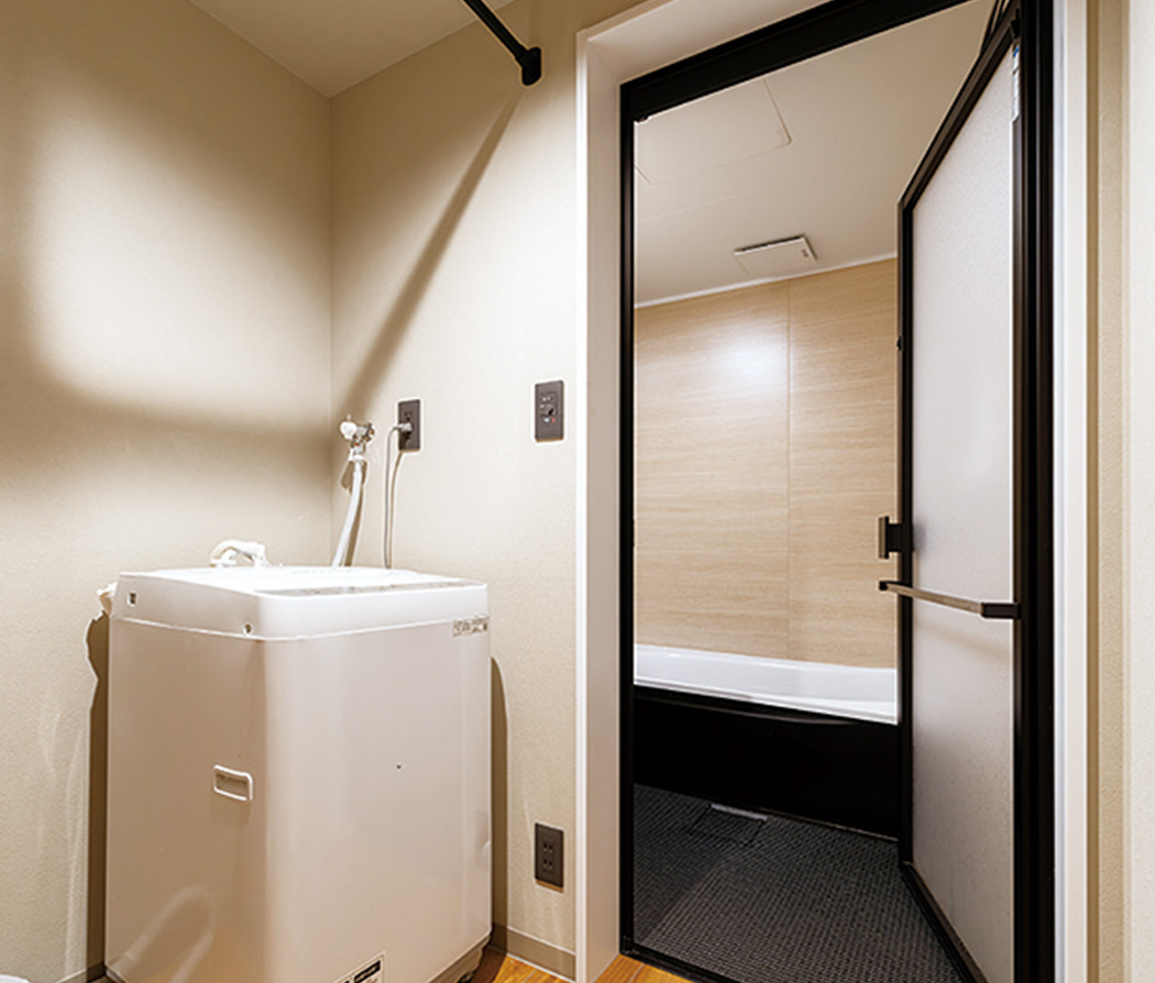 脱衣室は洗濯物を干せるアイアンのハンギングバーと浴室入り口のドア枠をブラックで統一。洗面台を外に設置しているためゆったりと使える。