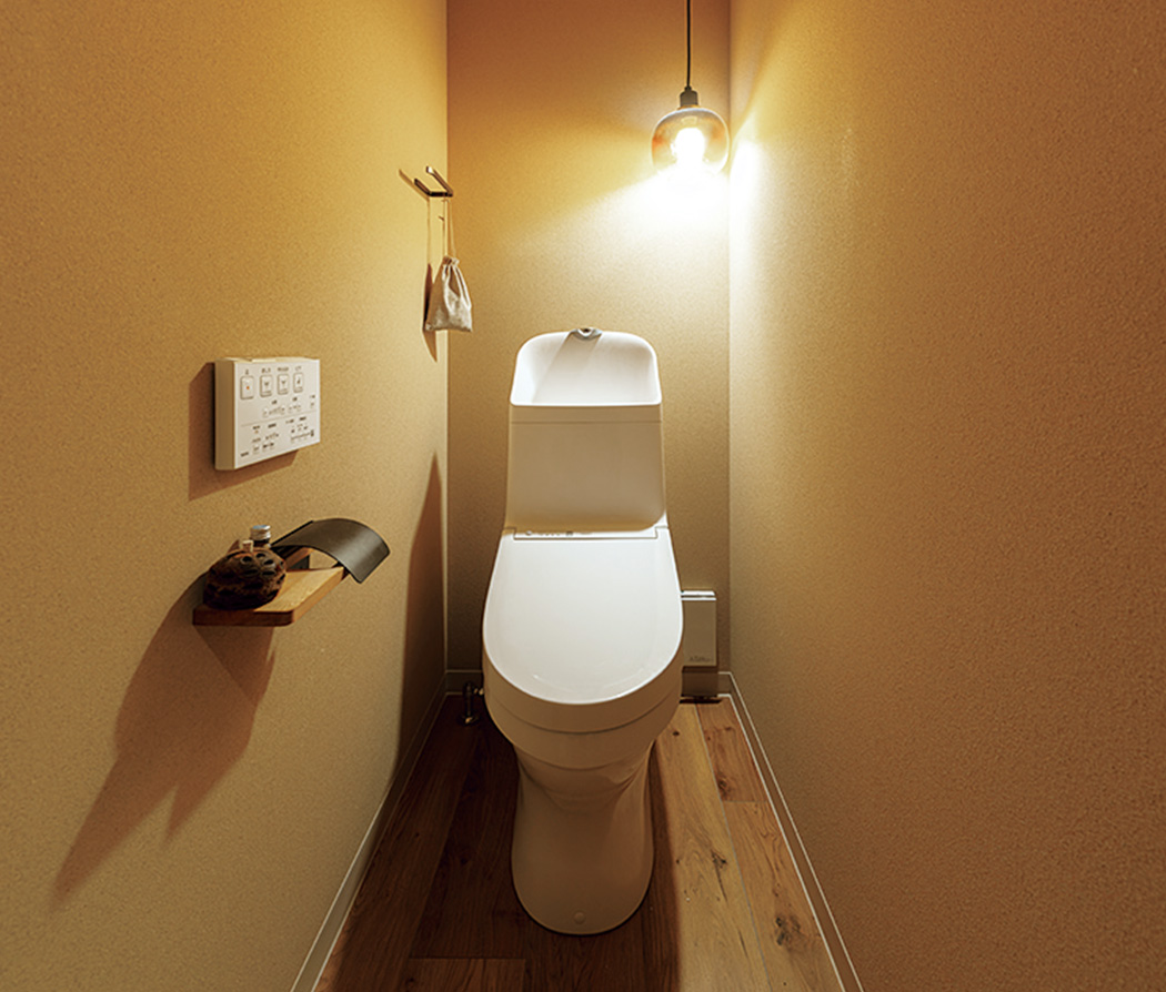 シンプルな空間にご夫婦が選んだ照明が映えるトイレ。手洗いは設けずペーパーホルダーと一体化した小さな棚とタオル掛けの最小限の設備にとどめた。