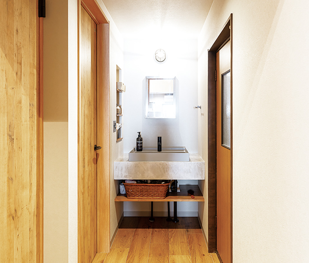 廊下に設置した造作洗面台にミラタップの洗面ボウルを組み合わせている。鏡はご主人が購入したもの。