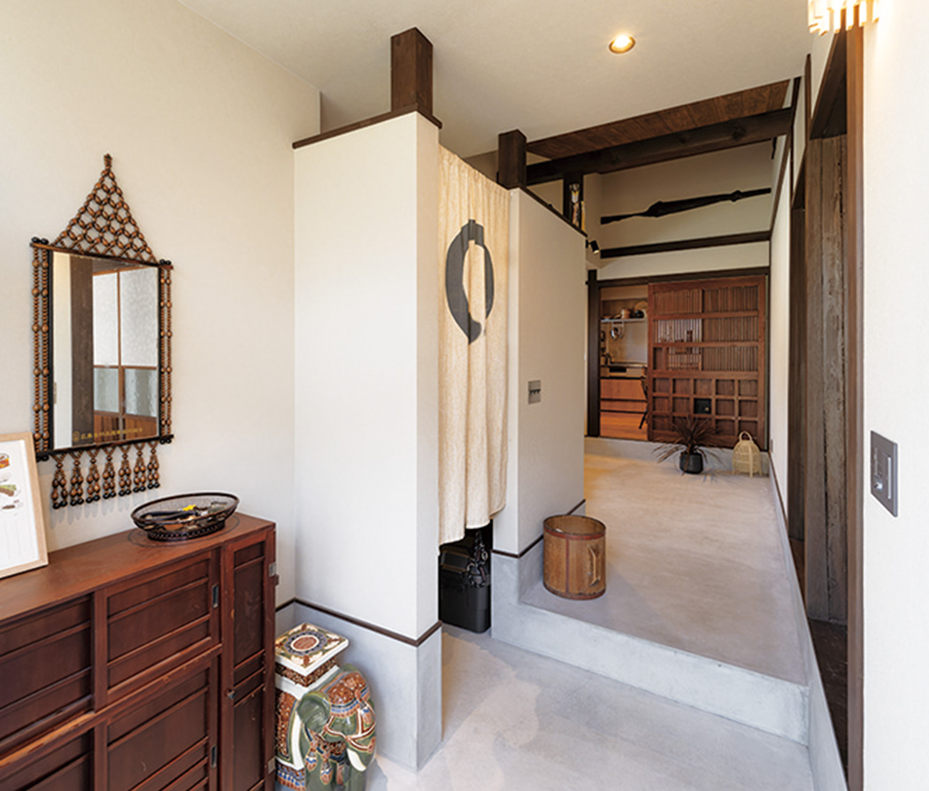セカンドリビングとしても使う土間に続く玄関。玄関収納や鏡、ゾウの置き物などもご夫婦がそろえたこだわりの品。土間収納はのれんで目隠ししている。
