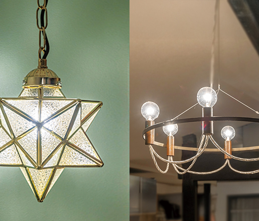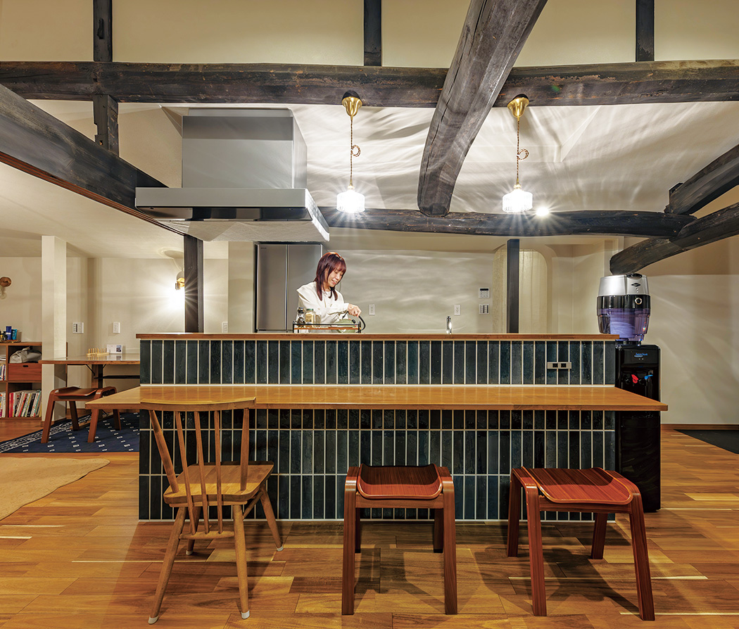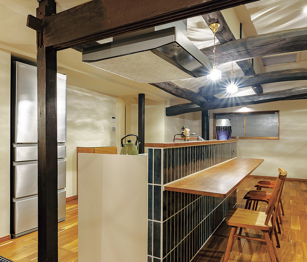 取り外せない柱は残し、塗装して空間のアクセントとして生かしている。古民家の雰囲気に合うアンティーク調のタイルで仕上げた。ペンダントライトの陰影が天井に美しく映える。