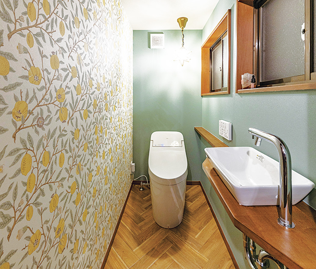 ゲストも使用するメインのトイレは「ウィリアム・モリス」の植物柄のクロスとモスグリーンのクロスで華やかに。床にはヘリンボーン柄のクッションフロアを用いた。