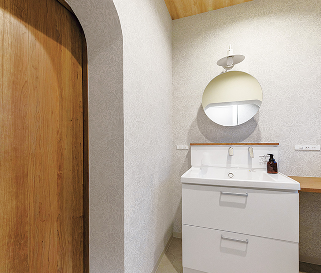 洗面脱衣室と浴室の間の壁は取り除けないため、そのまま残してアールの垂れ壁にした。仕方なく残した壁だが、ゲストに褒められるワンポイントに。