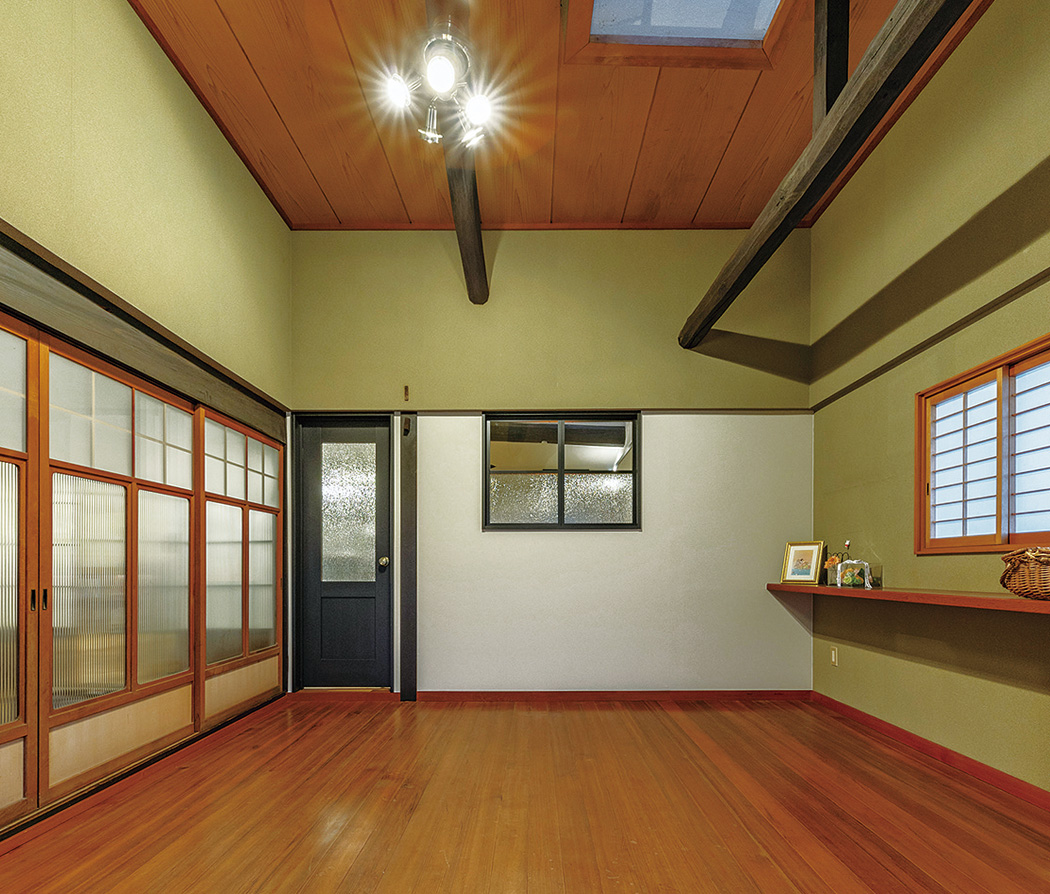 3部屋をつなげて広々としたLDKに。古民家ならではの太い梁を現しにして、天井の高い開放的な空間に。濃茶の梁とベージュのクロスを用いた、明る過ぎない落ち着いた空間をペンダントライトの光がやさしく照らす。
