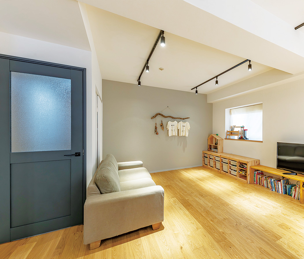 ダイニング側から見たLDK。天井のダクトレールに使ったアイアンやグレージュのアクセントクロスが空間を引き締め、スタイリッシュな雰囲気に。既存のLDKに隣接していた和室をつなげ、家族でくつろげる開放的なLDKに。
