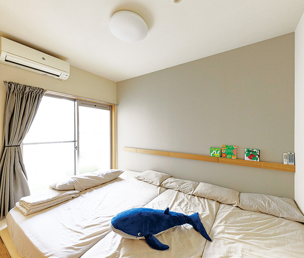 寝室はDIYで内装をリフレッシュ。床には上からクッションフロアシートを追い張りし、壁のクロスは既存のまま、1面だけグレージュのアクセントクロスを張り替えた。壁には飾り棚も設置