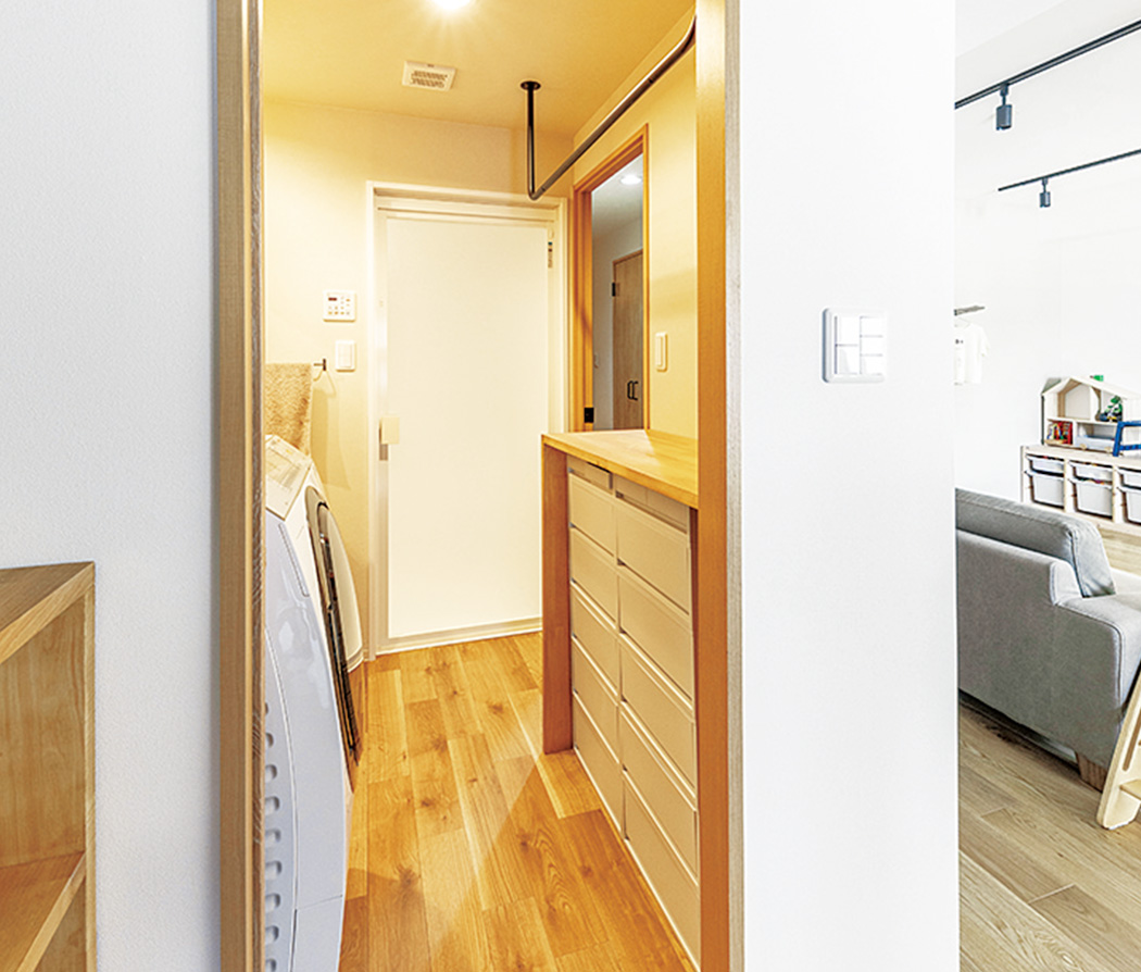 洗面脱衣室はキッチン側からも廊下側からも出入りできるレイアウト。料理をしながら洗濯や浴室掃除などがスムーズな動線でできる