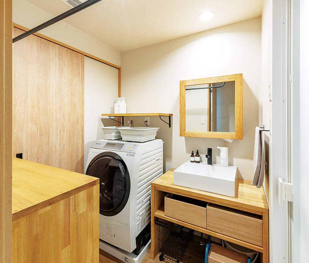 奥様の理想を叶えた、木のカウンターにスクエア型のボウルを組み合わせた造作洗面台。天井にはアイアンバーを設け、洗った洗濯物をすぐに干せるようにしている