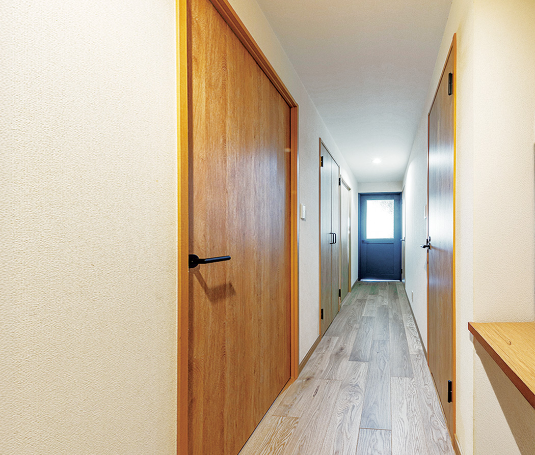 居室のドアは既存のものにDIYでリメイクシートを張ってリフレッシュ。ドアノブもDIYでアイアンタイプに付け替えている