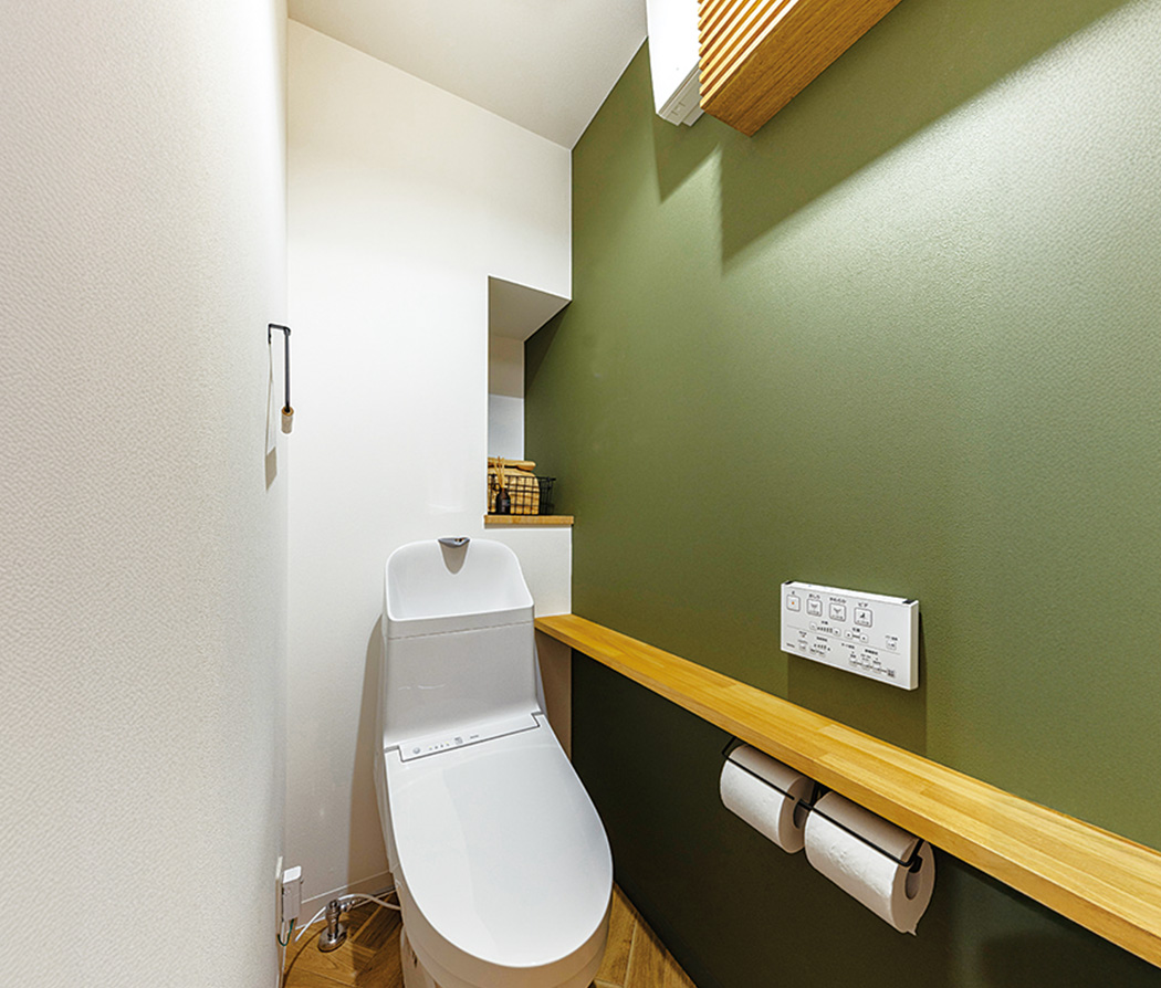 トイレはヘリンボーン柄のクッションフロアにモスグリーンのアクセントクロスをコーディネート。アクセントにもなる格子の囲いは分電盤を隠すためDIYでつくった