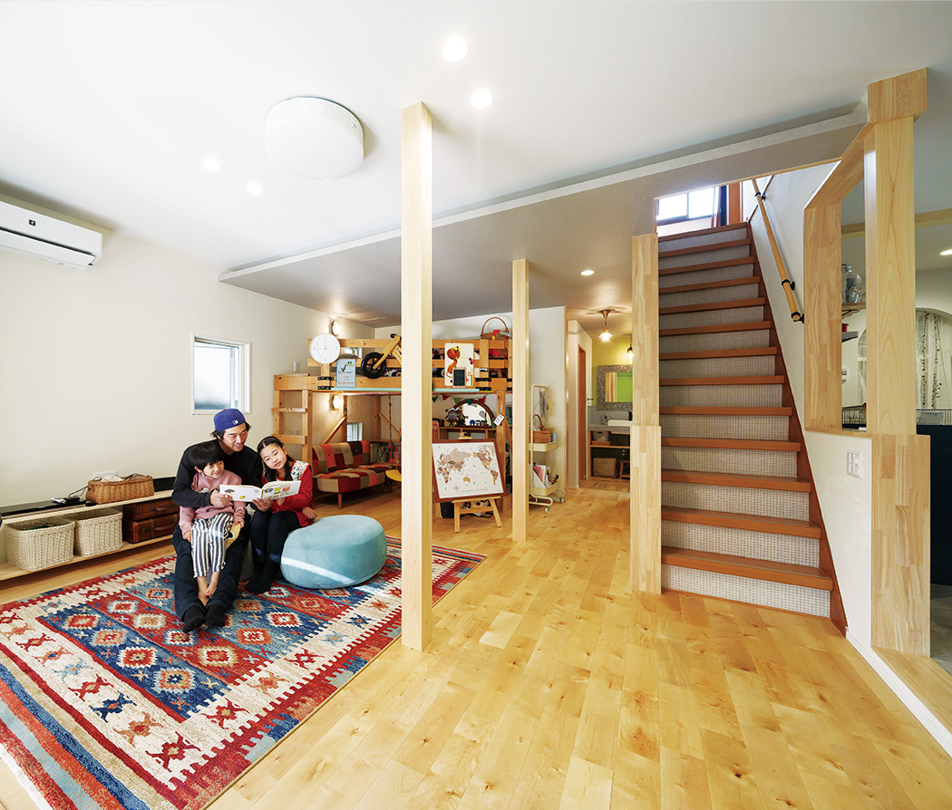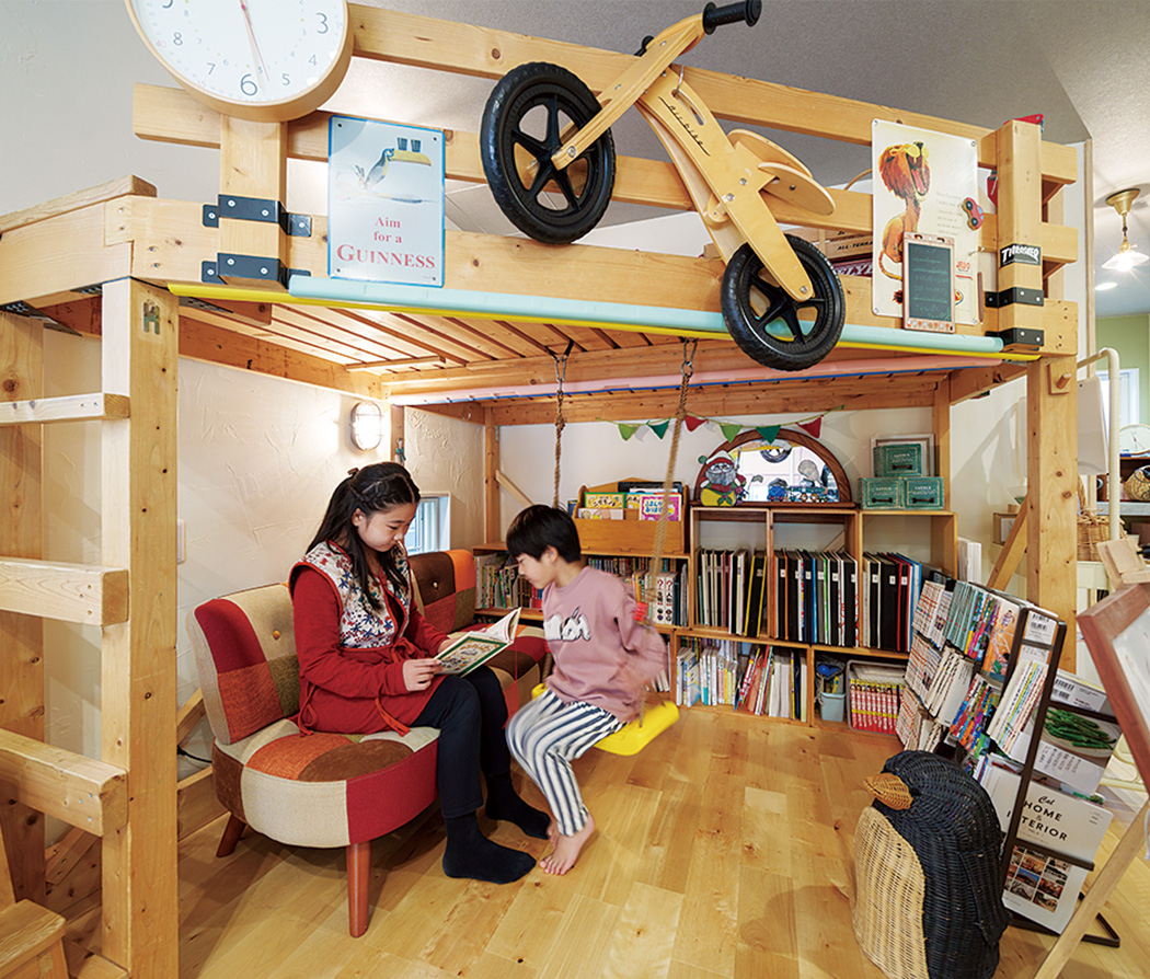 リビングと一体化して使えるフリースペース。ご主人による木製の遊び場に合わせて、こもった熱を外へ逃がすための小窓やマリンランプ、コンセントの位置を決定。