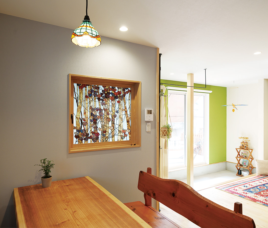 キッチン横に配置したダイニング。テーブルはご主人の手によるもので、玄関との間仕切り壁に開口した室内窓にはご主人のお母様が製作したステンドグラスを活用。