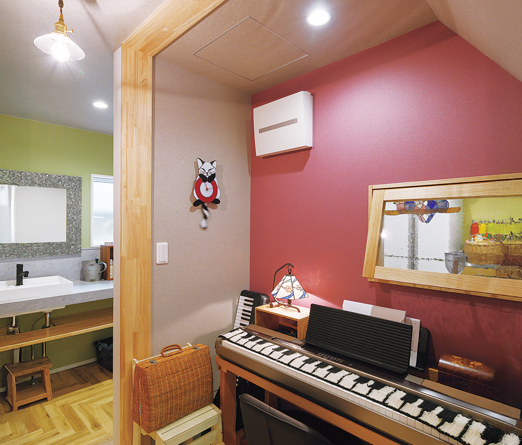 階段下の空間をピアノスペースとして有効活用。キッチンとの間仕切り壁にはすべり出しの室内窓を取り付け、ワインカラーのアクセントクロスも張った。