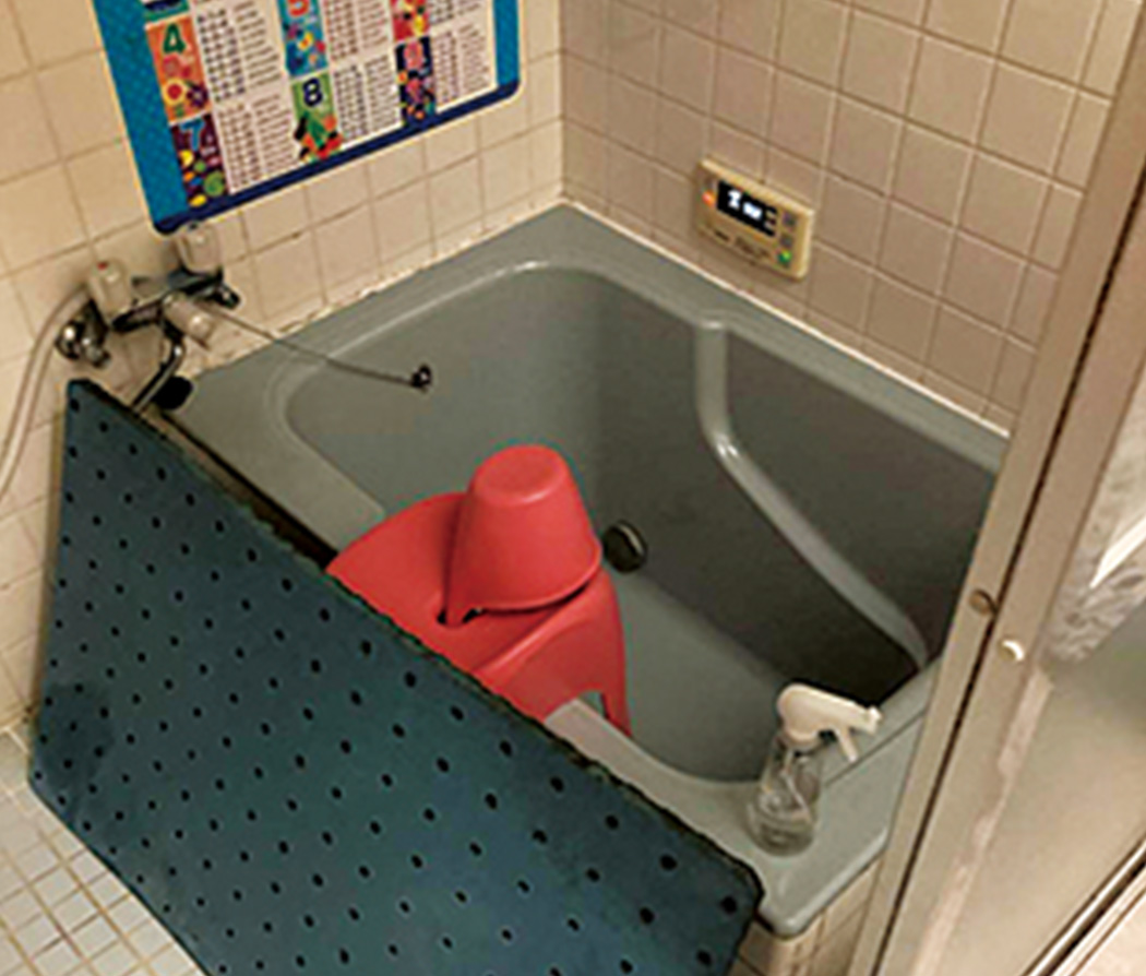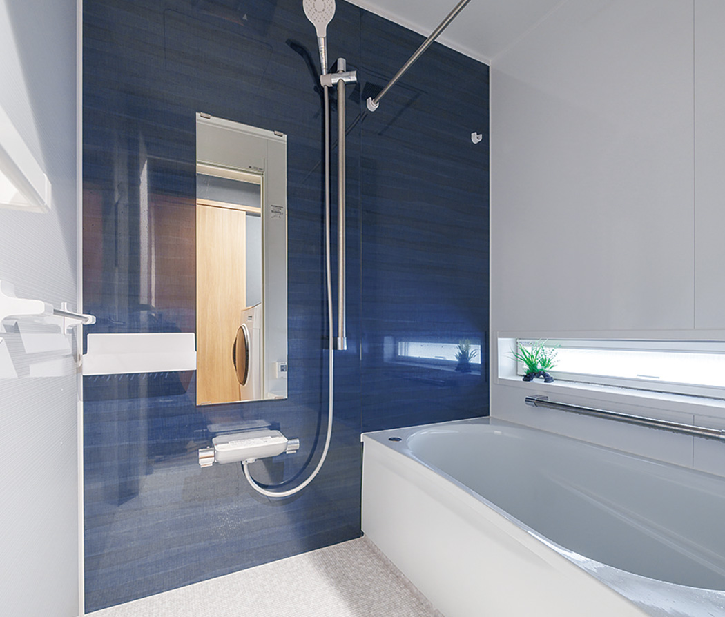 換気扇が回らなくなったときに備えて換気ができるよう、浴室には横長のすべり出し窓を開口。窓は外部から視線が入らないよう半透明にした。