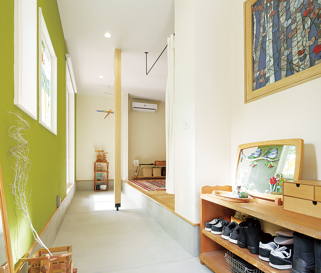 床をモルタル塗りにし、玄関収納は以前ご主人が造ったものをそのまま利用。南側の壁は明るいグリーンをアクセントカラーに採用した。