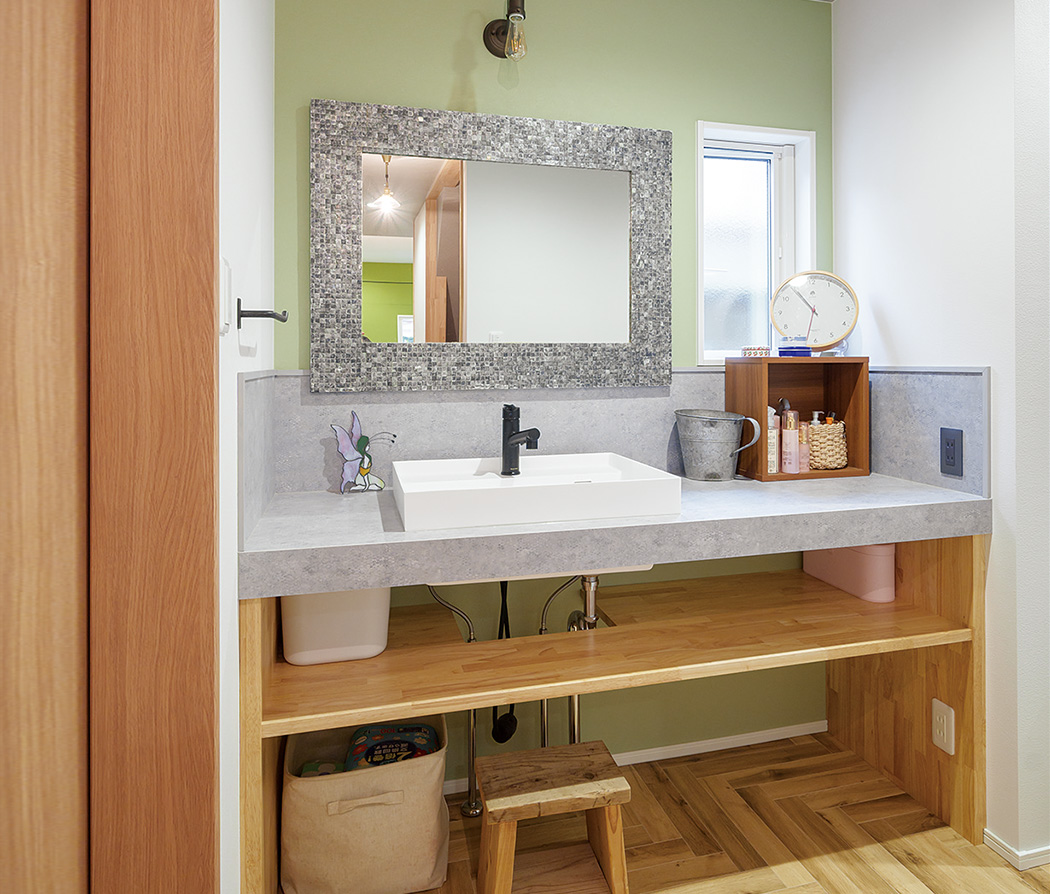 脱衣室とウォークスルークローゼットの間に配置した洗面室。洗面台は造作し、鏡は既存のものを再利用。ヘリンボーン張りしたようなフロアタイルがユニーク。