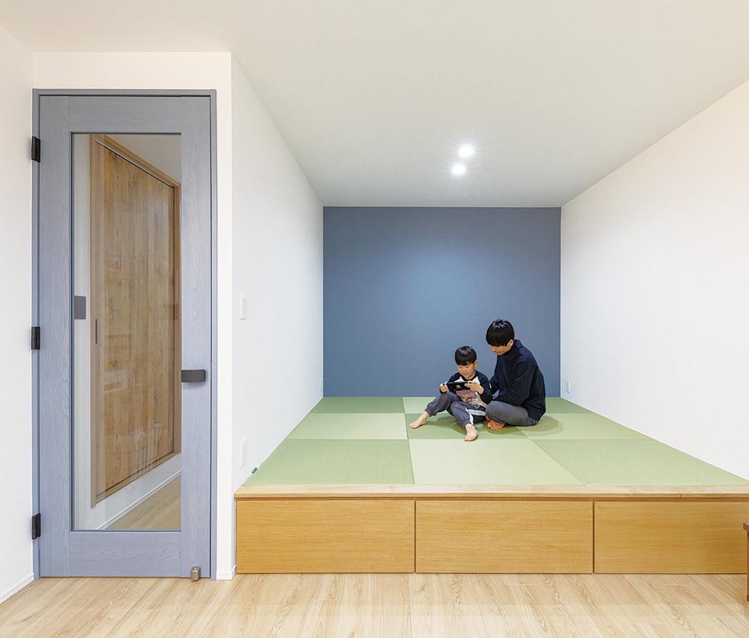 和室があった場所を小上がりの畳スペースに。お子さんとくつろいだりソファのように腰掛けたりできる。下が収納になっているためリビング収納としても活躍。将来的に洋室2室を子ども部屋として使うことになれば、小上がりをご夫婦の寝室として使えるよう、ダブルサイズの寝具が置ける広さを確保し、ロールスクリーンか引き戸を付けられるように天井を補強している。
