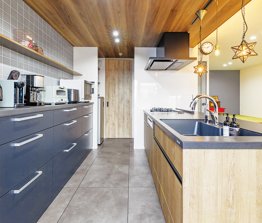 キッチンの壁はブルーのタイル風クロスを選択。オープンタイプの可動棚の収納のほか、右手奥にもパントリーを設けた。