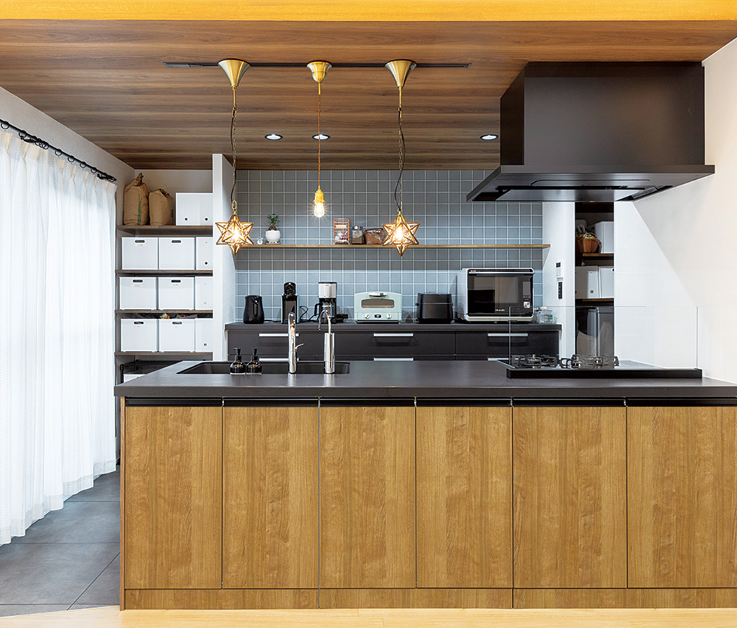 キッチンは木目とタイル風クロスで上質空間に
