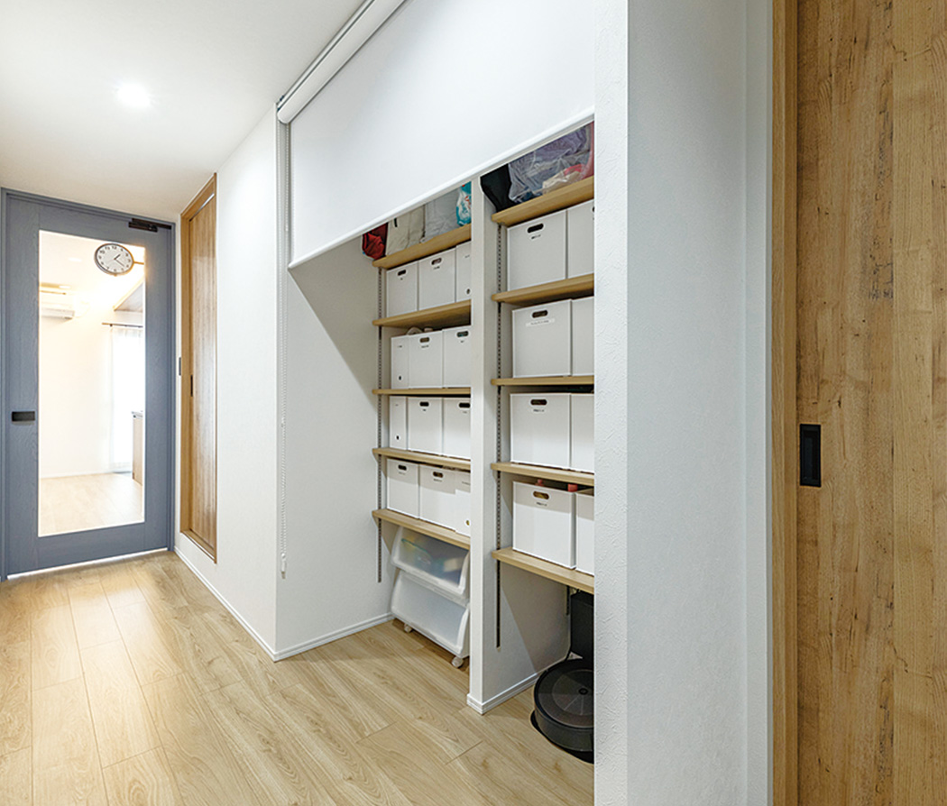 廊下の収納を拡大してすっきり分類。来客時はロールスクリーンで目隠しできるようにした。
