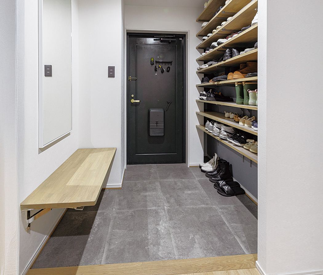 玄関には大容量の玄関収納を設置。靴の脱ぎ履きがしやすいよう、折り畳み式のベンチも取り付けている。